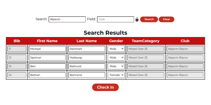 Built to handle race day check-in of pre-registered participants, able to handle individual registration or team registration. Take full control over which fields are shown and editable and on which fields to lookup participants from the event file.
